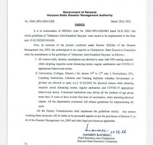 हरियाणा के मुख्य सचिव ने शुक्रवार को सभी जिलों के डीसी और सक्षम अधिकारियों को पत्र जारी कर बताया कि “महामारी अलर्ट-सुरक्षित हरियाणा” के दिशा-निर्देशों में संशोधन किया जा रहा है। इसके तहत अब सभी सिनेमा हॉल, थिएटर, मल्टीप्लेक्स को 50% बैठने की क्षमता के साथ खोलने की अनुमति है। इसके अलावा 10वीं से 12वीं के स्कूलों के साथ आईटीआई, कोचिंग कक्षाएं भी 1 फरवरी से शुरू होंगी।