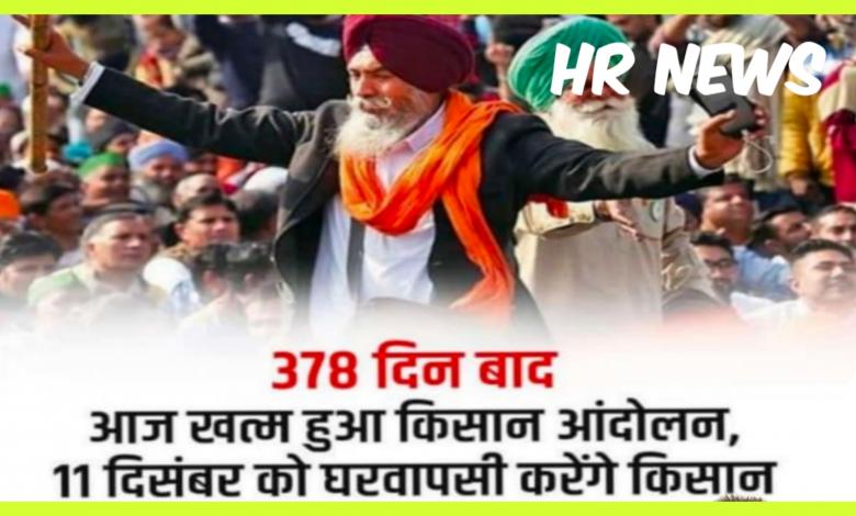 दिल्ली बॉर्डर पर 378 दिन से चल रहा किसान आंदोलन खत्म हो गया है। केंद्र सरकार द्वारा तीनों कृषि कानूनों की वापसी के बाद करीब एक साल बाद किसानों ने आज आंदोलन खत्म करने का ऐलान कर दिया। संयुक्त किसान मोर्चा ने बैठक कर आंदोलन खत्म करने की घोषणा की। साथ ही बताया कि आंदोलन कर रहे किसान अब 11 दिसंबर से घर की लौटने शुरू हो जाएंगे।