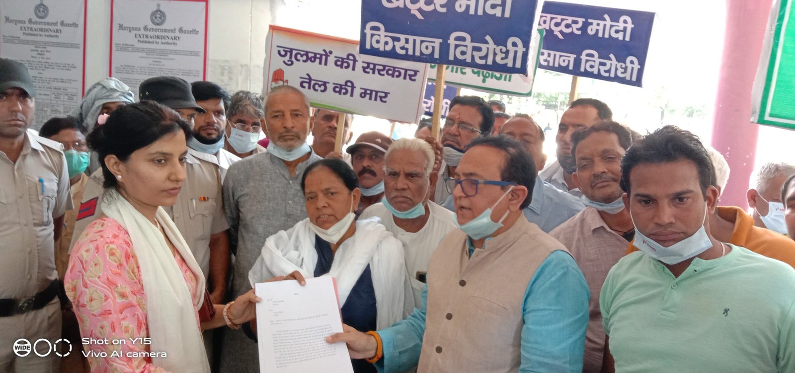 रेवाडी, पूर्व मंत्री कैप्टेन अजय सिंह यादव ने किसानों व कांग्रेसी कार्यकर्ताओं के साथ बाजरा का न्यूतम समर्थन मूल्य, डीएपी खाद नही मिलने बारे, मंहगाई व रोडों की दुर्दशा को लेकर मुख्यमंत्री हरियाणा मनोहर लाल खट्टर के नाम अतिरिक्त उपायुक्त आशिमा सांगवान को ज्ञापन सौंपा। राजीव चौक से सचिवालय तक जाते हुए सभी ने सरकार के खिलाफ जमकर नारेबारी की। इस दौरान पत्रकारों से बातचीत करते हुए कैप्टेन अजय सिंह ने कहा कि सरकार की कथनी और करनी में अंतर है। सरकार ने किसानों के बाजरे का एक-एक दाना खरीदने का वायदा किया था। लेकिन रेवाडी में बाजरे की सरकारी खरीद न होने से बाजरा अब तक ११०० रुपये से लेकर १२५० रुपये प्रति क्विंटल तक ही बिक पाया है। सरकार ने बाजरे का न्यूनतम समर्थन मूल्य २२५० रुपये घोषित कर रखा है व भावांतर भरपाई योजना के तहत ६०० रुपये प्रति क्विंटल देने जी घोषणा की हुई है। लेकिन भावांतर के बाद भी किसानों को बाजरा १७०० रुपये से लेकर १८५० रुपये प्रति क्विटल ही पडेगा। इससे किसान खासे नाराज हैं। बाजरा दक्षिणी हरियाणा की मुख्य फसल है व किसानों का जीवन व्यापन इस फसल पर काफी निर्भर करता है। ऐसे में सरकार भावांतर भरपाई योजना के तहत कम से कम इतनी राशि जरूर दें कि उससे वह न्यूनतम समर्थन मूल्य से कम पर न पडे। यादव ने आरोप लगाते हुए भाजपा को नकारा और पूंजीपतियों की सरकार बताया।