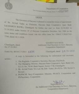 हरियाणा भाजपा के नेता अरविन्द यादव को 2020 में हरको बैंक का चैयरमेन लगाया था। राज्यपाल के आदेशानुसार उनके कार्यकाल को बढ़ाकर अगले एक वर्ष के लिए बढ़ाकर अक्टूबर 2022 तक कर दिया गया है।