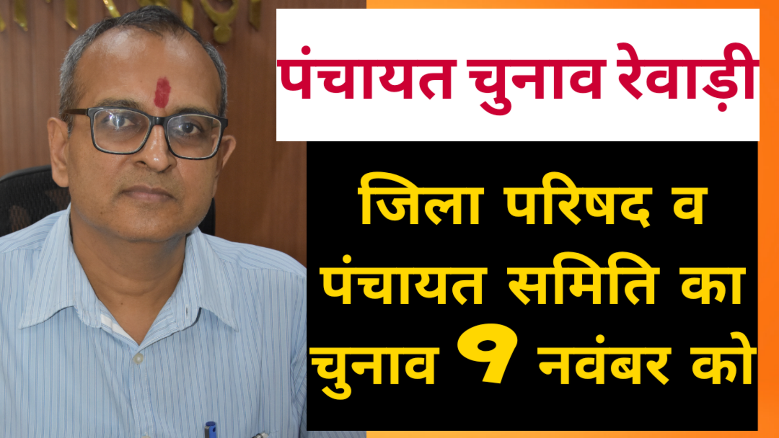 डीसी एवं जिला निर्वाचन अधिकारी (पंचायत) अशोक कुमार गर्ग ने निर्वाचन आयुक्त की ओर से जारी शेड्यूल के तहत बताया कि पंचायती राज संस्थाओं के चुनाव की घोषणा के साथ ही जिला के ग्रामीण क्षेत्रों में तत्काल प्रभाव से आदर्श आचार संहिता लागू हो गई है। उन्होंने कहा कि सरपंच, पंचायत समिति सदस्यों व जिला परिषद सदस्यों का मतदान ईवीएम से होगा जबकि पंच पद का मतदान बैलेट पेपर से होगा। उन्होंने रेवाड़ी जिला में ग्रामीण क्षेत्र के मतदाताओं से अपील की कि वे पंचायती राज चुनावों में बढ़चढ़ कर हिस्सा लें।