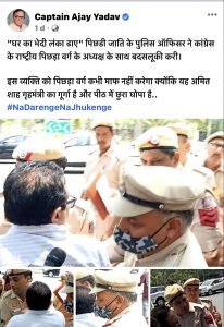 अखिल भारतीय गुर्जर देव सेना हरियाणा के युवा प्रदेश अध्यक्ष अधिवक्ता हिमांशु सिराधना ने कांग्रेस  के  पूर्व मंत्री व कांग्रेस के पिछड़ा वर्ग के चेयरमेन कप्तान अजय  सिंह यादव पर  हमला  बोलते हुए  कहा है की पिछले दो  तीन  दिनों  से कप्तान साहब रेवाड़ी  में घटती  टी.आर.पी  के बाद  अब  दिल्ली में अपनी टी.आर.पी बढ़ा  रहे  है जिसके  चलते  कुछ  वीडियो  उनकी  उनके खुद  के  फेसबुक पेज  व अन्य माध्यम  से  खूब  वायरल हो  रही  है जिसमे पहेली वीडियो में  एक पिछड़े  वर्ग  से सम्बन्ध रखने वाले दिल्ली पुलिस के अधिकारी के सम्बन्ध में  उसपर   “घर का बेधी लंका ढाये” की  टिपणी करते  नजर आरहे है व यह  कहते नजर आरहे है की मै पिछड़ा वर्ग कांग्रेस का चेयरमैन हु और पिछड़ा वर्ग से  होने के नाते तुम ये ठीक नहीं कर रहे हो और पिछड़ा वर्ग एकता की बात कर  रहे है।