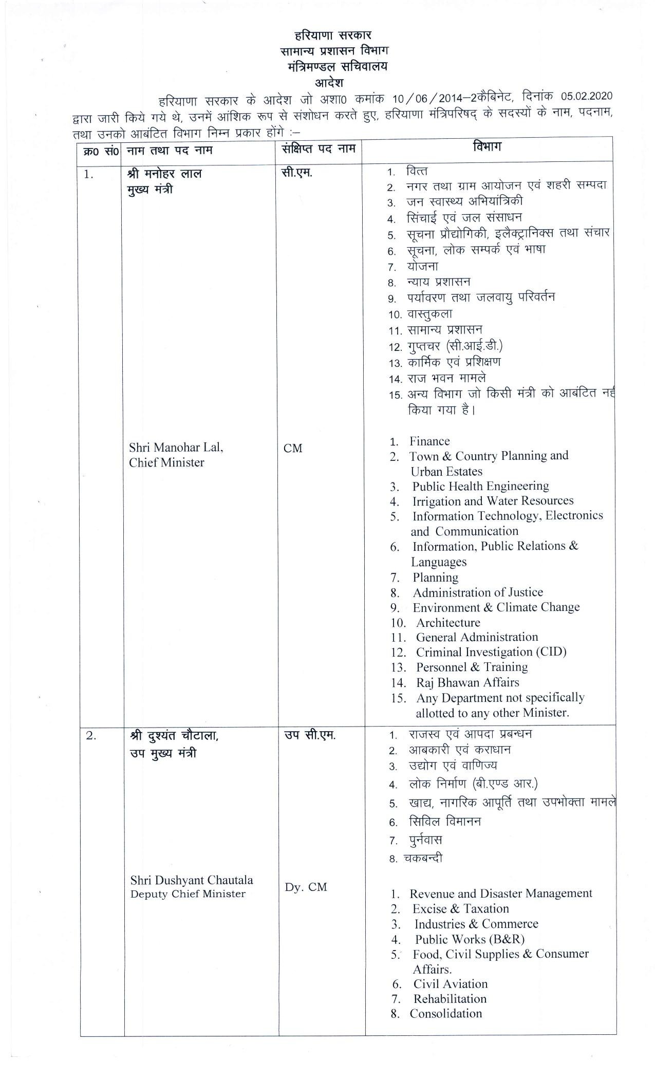 हरियाणा मंत्रीमंडल विस्तार में दो नये मंत्रियों को शपथ दिलाई गई है। अब सभी महकमों के अलग अलग प्रभागों को लेकर सरकार की तरफ से पोर्टफोलियो जारी कर दिया गया है जिसमें अलग अलग मंत्रियों के विभागों का जिक्र है।