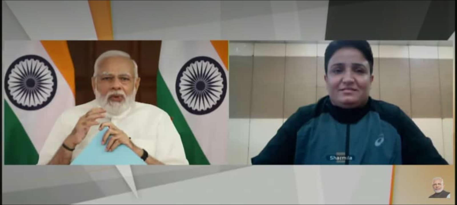 पीएम ने खिलाड़ी शर्मिला से बातचीत करते हुए कहा कि आपने 34 वर्ष की आयु में खेल में अपना कैरियर शुरू किया और मात्र दो वर्ष में गोल्ड मैडल भी जीतकर दिखा दिया। उन्होंने शर्मिला से पूछा की मैं जरूर जानना चाहूंगा कि ये चमत्कार कैसे हुआ आपकी प्रेरणा क्या है। उन्होंने कहा कि आप देश के लिए रोल मॉडल हैं। प्रधानमंत्री ने उनके परिवार के उज्ज्वल भविष्य की भी कामना की। शर्मिला ने कहा कि वे प्रधानमंत्री नरेंद्र मोदी से संवाद करके बहुत खुश हैं। उन्होंने कहा कि प्रधानमंत्री नरेंद्र मोदी की प्रेरणा उनके लिए पदक जीतने में सहायक सिद्ध होगी। उन्होंने बताया कि वे तुलाराम स्टेडियम, रेवाड़ी में खेल विभाग में कार्यरत टेक चंद पैरा एथलेटिक्स प्रशिक्षण से प्रशिक्षण ले रही हैं।