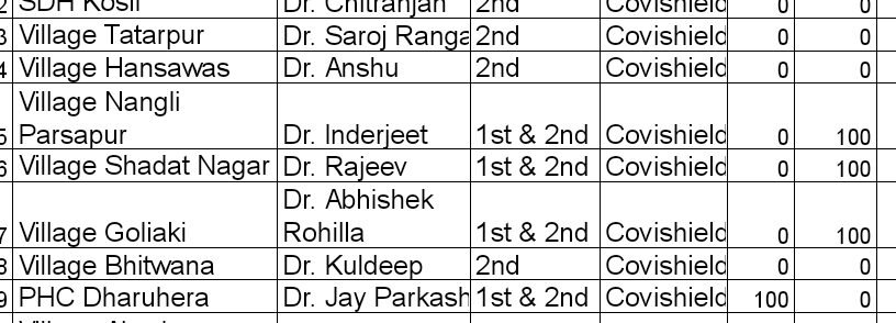 | 5 | CHC Nahar | Dr. Rajeev | 1st & 2nd | Covishield | 100 | 0 | 0 | 100 |